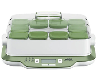 12 pots de 140 ml. Minuteur et arrêt automatique. 6 programmes pour yaourts, desserts lactés ou végétaux, fromages blancs et desserts. Inclus : 12 pots avec couvercle, 12 égouttoirs, louche, cuillère doseuse, livre de recettes. Garantie 2 ans.